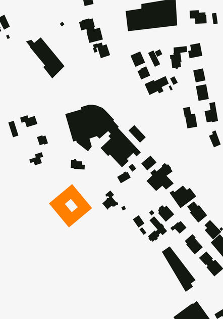 Der schwierige Zuschnitt des Bauplatzes, als auch das sehr komplexe Raumprogramm fordert die Entwicklung eines kompakten Baukörpers. Die Wahl eines Quadrats ermöglicht eine zentrale Position am Grundstück und ermöglicht es so ausreichend Fläche für den Verkehr, als auch den Vorplatz vorzusehen. Des Weiteren entsteht durch diese Setzung die Möglichkeit einer großen zusammenhängenden Freifläche. Der an der nördlichen Grenze des Grundstücks positionierte Fuß & Radweg wirkt als verbindendes Element und führt direkt zum Vorplatz welcher durch den umgepflanzten Apfelbaum markiert wird. Die Zulieferung für die Ausspeiseküche wird an der Westseite vorgesehen eine direkte Anlieferung, als auch Abholung ermöglichen zu können. Die Auskragung des Baukörpers zoniert den Zugang und bietet ebenfalls die Möglichkeit gedeckter Stellplätze.